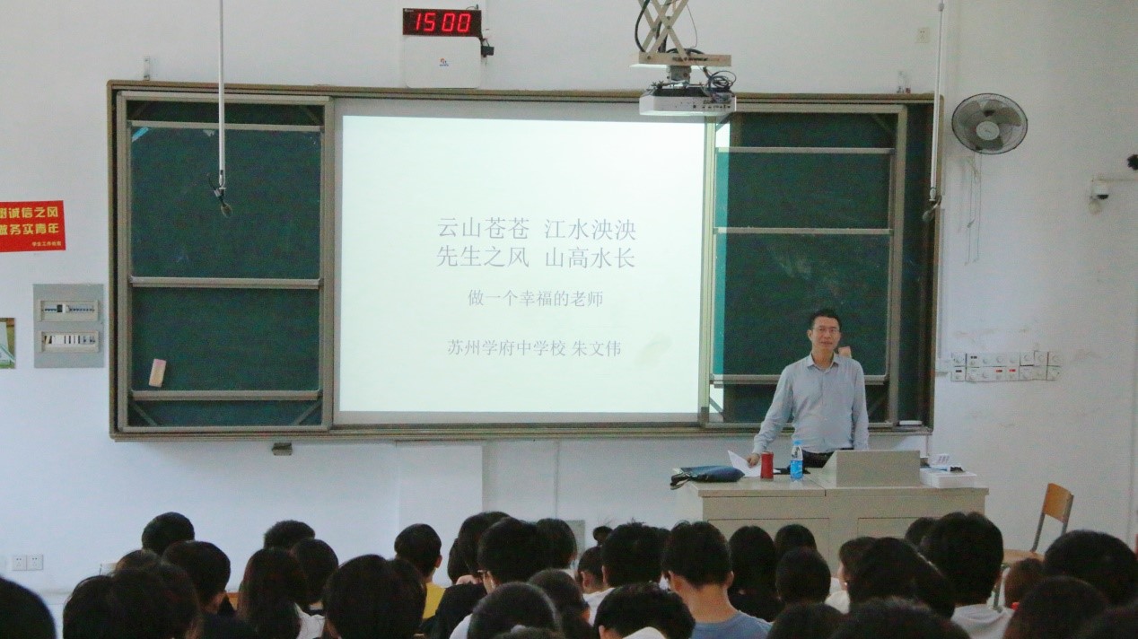 5月29日下午,williamhill英国中文邀请苏州学府中学校校长、教学名师朱文伟为生物(科学)师范和化学师范专业学生开展了一场专题讲座,主题为“做一个幸福的老师”。学院院长李良智、党委副书记兼副院长苗雪强以及生物系部分教师参加活动。