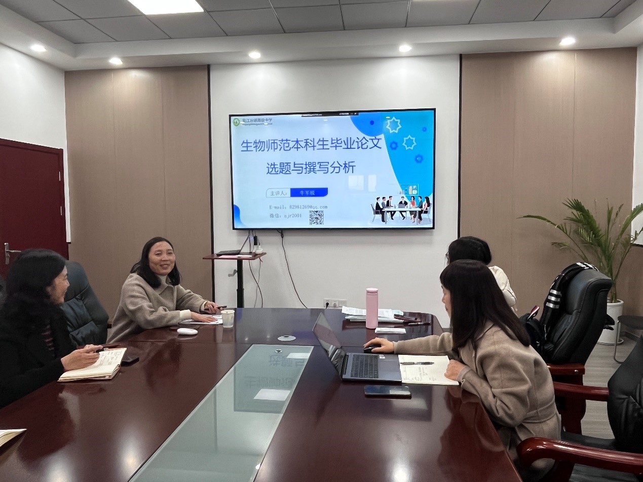为切实做好生物科学(师范)专业本科毕业论文管理工作,从源头上把控毕业论文质量,进一步规范毕业论文选题,2024年12月11日下午,化生学院在教三楼319会议室召开了2025届生物师范本科毕业论文选题研讨会。本次会议特邀化学系宋瑞峰教授和我院优秀校友汾湖高级中学生物教研组组长牛军锐老师作为主讲嘉宾,学院副院长秦粉菊及生物系全体教师参加了此次会议,会议由学院教师发展中心主任陈佳佳主持。