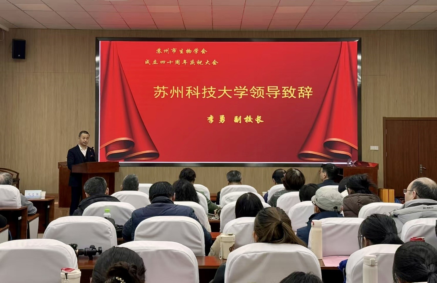 我校党委常委、副校长李勇在致辞中向苏州市生物学会致以最热烈的祝贺。他指出,40年来,苏州市生物学会始终秉承优良传统,紧跟时代步伐,不断发挥自身优势,在学术研究、科普教育、会员服务等方面取得了丰硕成果。希望学会能够以40周年为新的起点,继续发扬优良传统,勇攀学术高峰,再创新绩;同时,在推动生物学与其他学科交叉融合上积极探索,为苏州乃至全国的生物学事业发展作出更大的贡献。