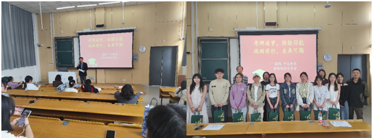 活动伊始,学院党委书记丛春秋作开场致辞。他结合当前就业形势与学科发展前景,系统阐述了考研深造对个人成长和职业发展的重要意义,并通报了学院近年考研录取率持续提升的喜人数据,鼓励同学们坚定信心、合理规划大学生活,科学备考,力争实现升学目标。随后,9位2025年考研成功的学生代表依次登台,围绕院校专业选择、备考时间规划、复试技巧及心态调整策略等核心问题展开经验分享。他们以亲身经历为案例,详细剖析了大学学习各阶段的课程特点和备考各阶段的重点、难点,为学弟学妹提供了可借鉴的实战建议。交流环节,刘恒蔚和胡翠英老师强调了夯实基础、理性选择和科学备考,辅导员黄开宇和王之梦老师则聚焦心理调适,并提醒学生平衡学业与生活。
