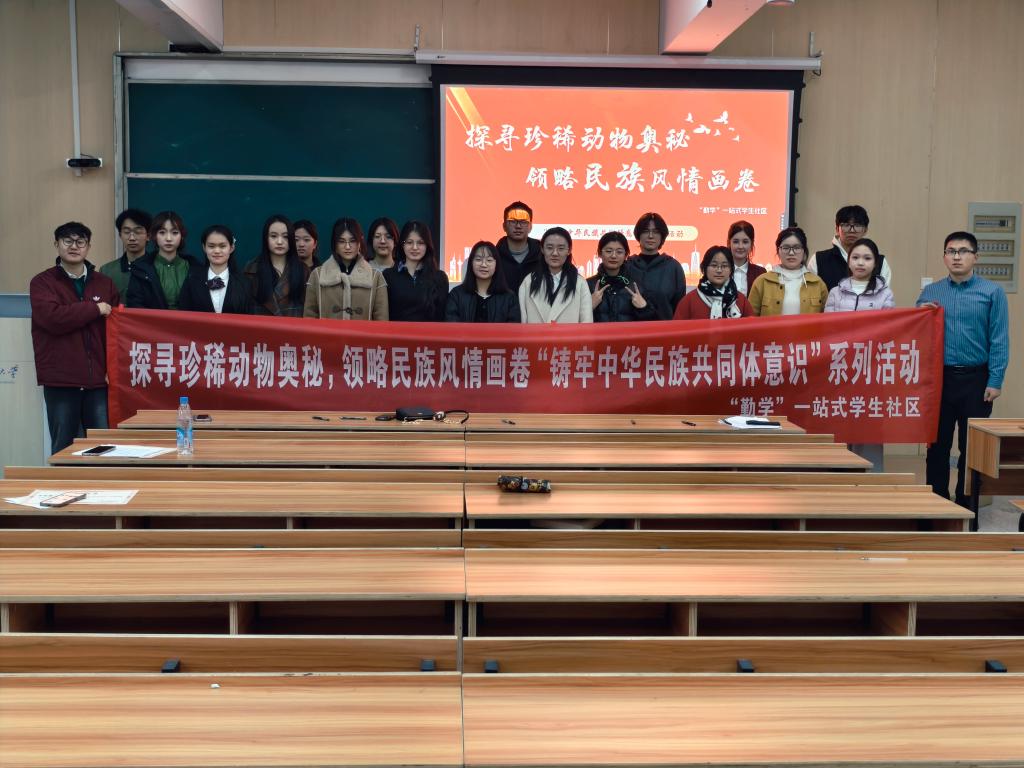 为深入学习贯彻习近平总书记关于加强和改进民族工作的重要思想,全面落实中央民族工作会议精神,2025 年 12 月 3 日,“勤学” 一站式学生社区(williamhill英国中文)精心组织 “探寻珍稀动物奥秘,领略民族风情画卷” 主题活动。来自全校 5 个学院、涵盖 20 多个民族的 130 余名师生代表齐聚一堂,以生态赋能民族团结教育,在沉浸式体验中深化对中华民族多元一体格局的政治认同、思想认同、理论认同、情感认同,切实铸牢休戚与共、荣辱与共、生死与共、命运与共的共同体理念。