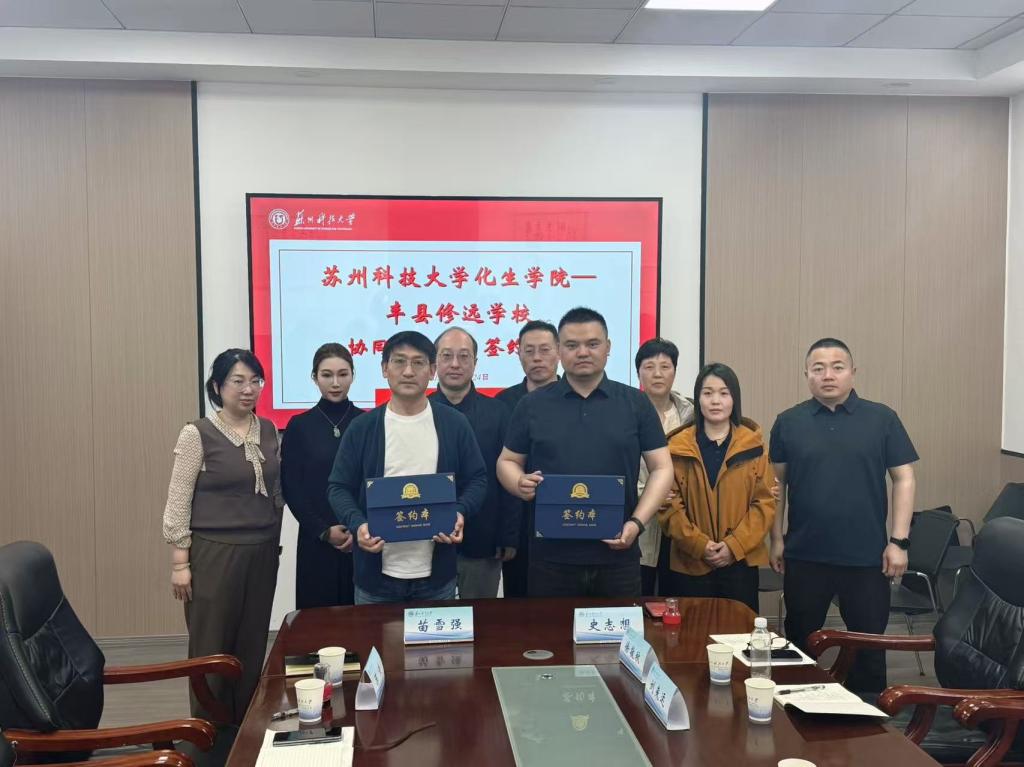 活动伊始,来访嘉宾漫步苏科大校园,沿塔影湖—体育馆—学院环线游览校园景致,沉浸式感受校园深厚的人文底蕴与浓厚的学术氛围。参观结束后,双方于学院会议室开展专题座谈。会上,学院党委书记徐治初详细介绍了学校办学底蕴、学科发展优势、人才培养体系以及学院建设概况。学院党委副书记苗雪强围绕学院科普育人基地建设、苏州市珍稀动物科普馆特色育人平台作专项分享。随后,材料化学系专业教师袁妍针对双方协同育人合作课题进行细致讲解,明晰研学共建、生涯启蒙、人才衔接培养等合作方向,明确后续共建规划与落地举措。交流发言环节,丰县修远学校校方代表分享了学校办学理念、育人特色与生源培养需求,表达了依托高校优质资源开展研学实践、生涯教育、人才贯通培育的合作愿景。最后,双方正式举行协同育人项目签约仪式,达成长期稳定战略合作共识。