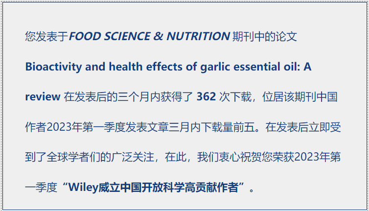近期,我校化生学院生物系师生在Wiley旗下的食品医药领域期刊《Food Science & Nutrition》中发表的研究论文“Bioactivity and health effects of garlic essential oil: A review”受到了全球学者们的广泛关注。论文第一作者为化生学院生物系硕士研究生黄磊,通讯作者为生物系王桃云副教授。