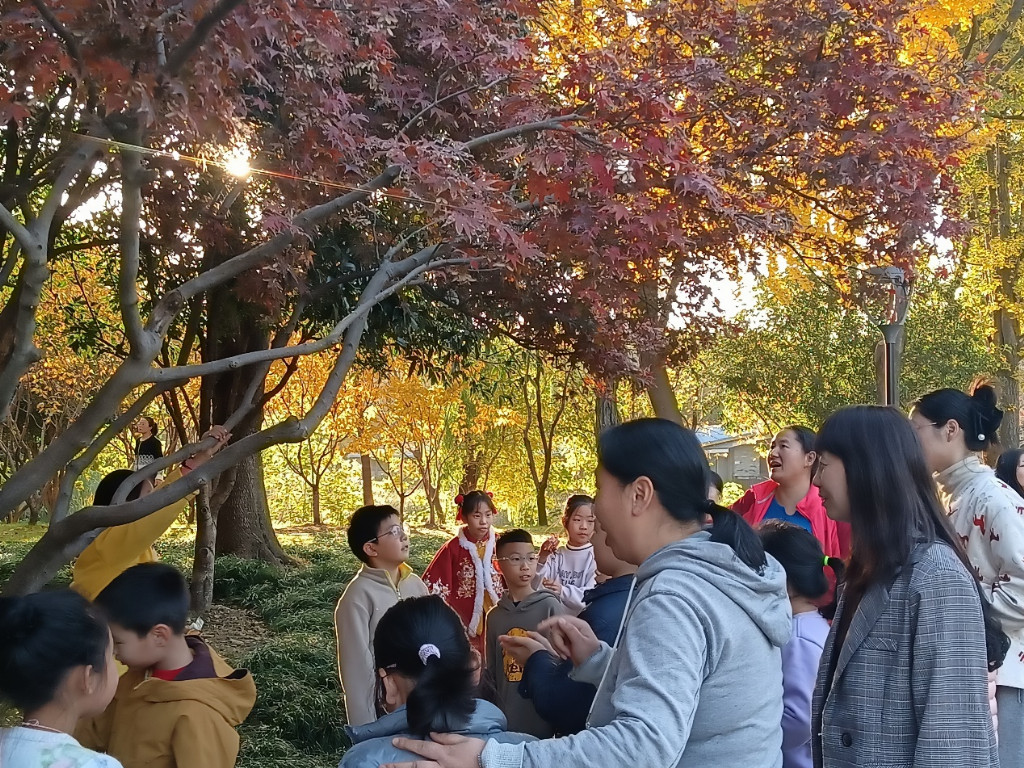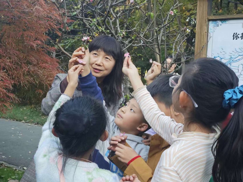 讲座结束后,大家来到玉山公园开展户外亲子认知活动。在科普志愿老师胡翠英、王苗苗的引导下,孩子们化身为“自然小侦探”,仔细观察并认识了身边的多种植物:金黄的银杏、红果累累的南天竹、叶形独特的桃叶珊瑚、色彩斑斓的乌桕、优雅的垂丝海棠、挺拔的针叶松、古朴的铁树……志愿老师不仅讲解了这些植物的名称特征,更分享了它们与环境适应的生存智慧。孩子们认真记录,积极提问,在真实的自然环境中加深了对植物多样性的理解。