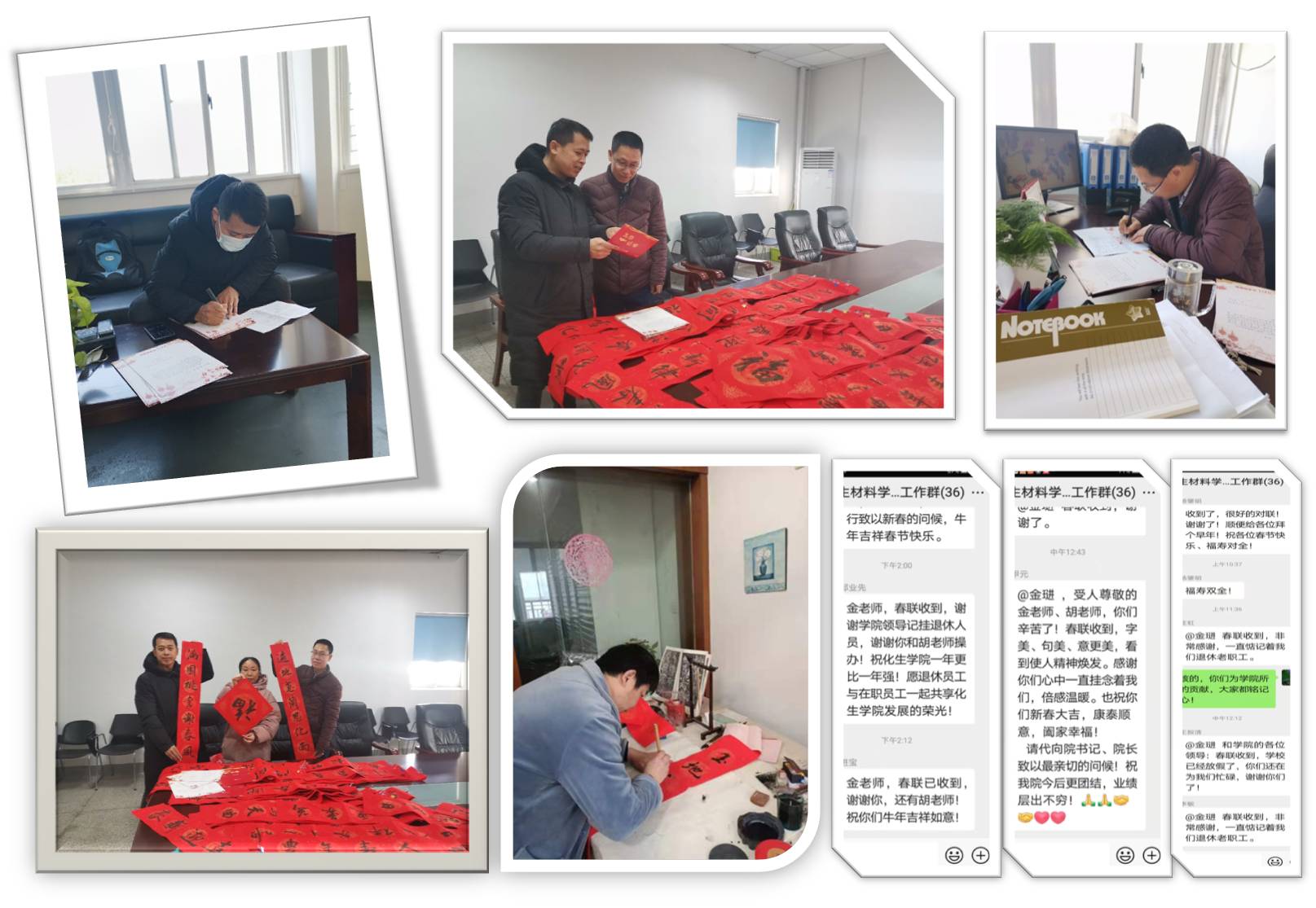“一纪开端迎金牛,三春肇始举玉杯”“遍地蕙兰思化雨,满园桃李谢春风”“人逢盛世千家乐,庭沐春阳万事兴”……一幅幅充满深情厚谊的春联,一张张寄托吉祥如意的福字,方寸之间,笔墨所咏,从不同角度表达了对新时代的讴歌、对教育事业的热爱、对美好生活的赞美、对离退休老同志的真挚祝福。同时,学院还准备了精致的新春信笺,连同春联福字一起寄送到各位离退休教师家中,以朴素而真挚的方式为各位离退休教师的新春佳节增添祥和美好的氛围。