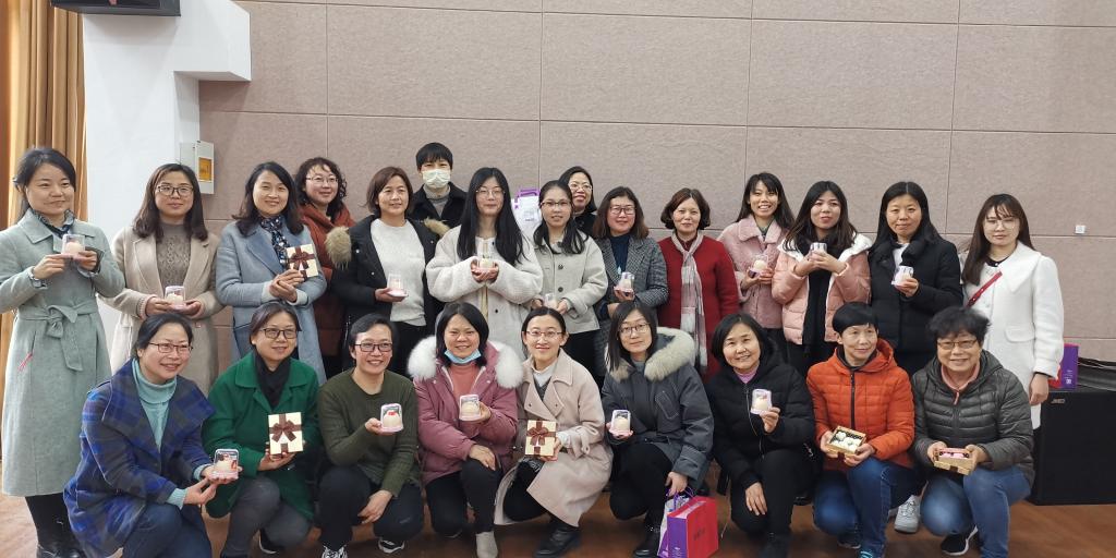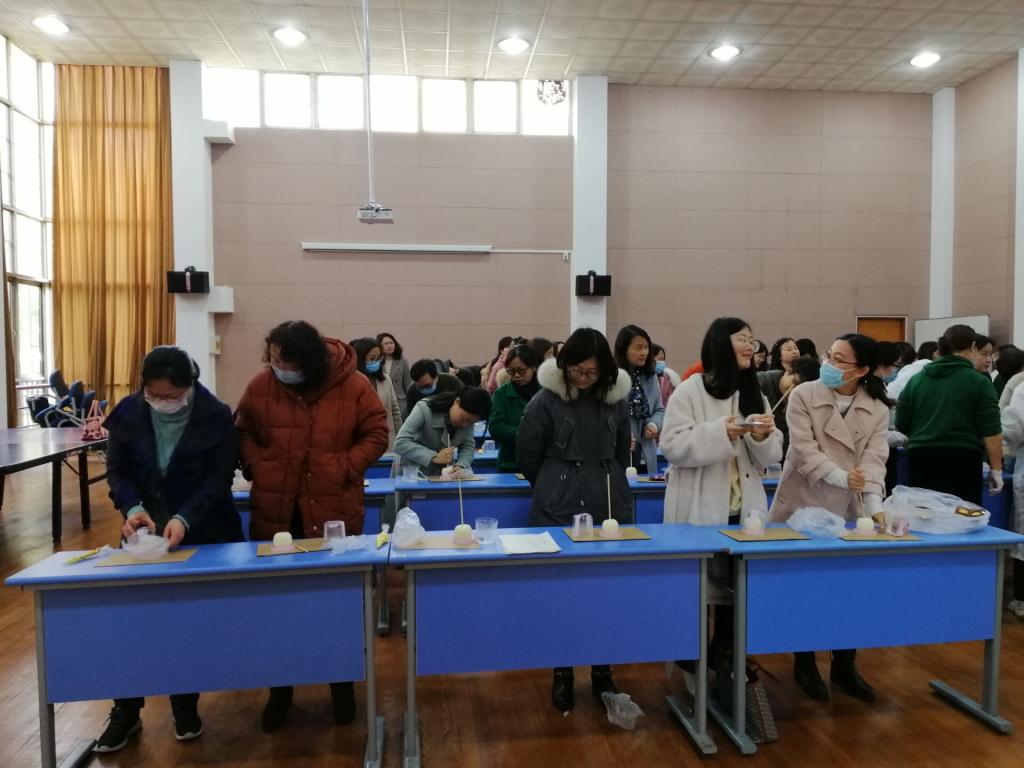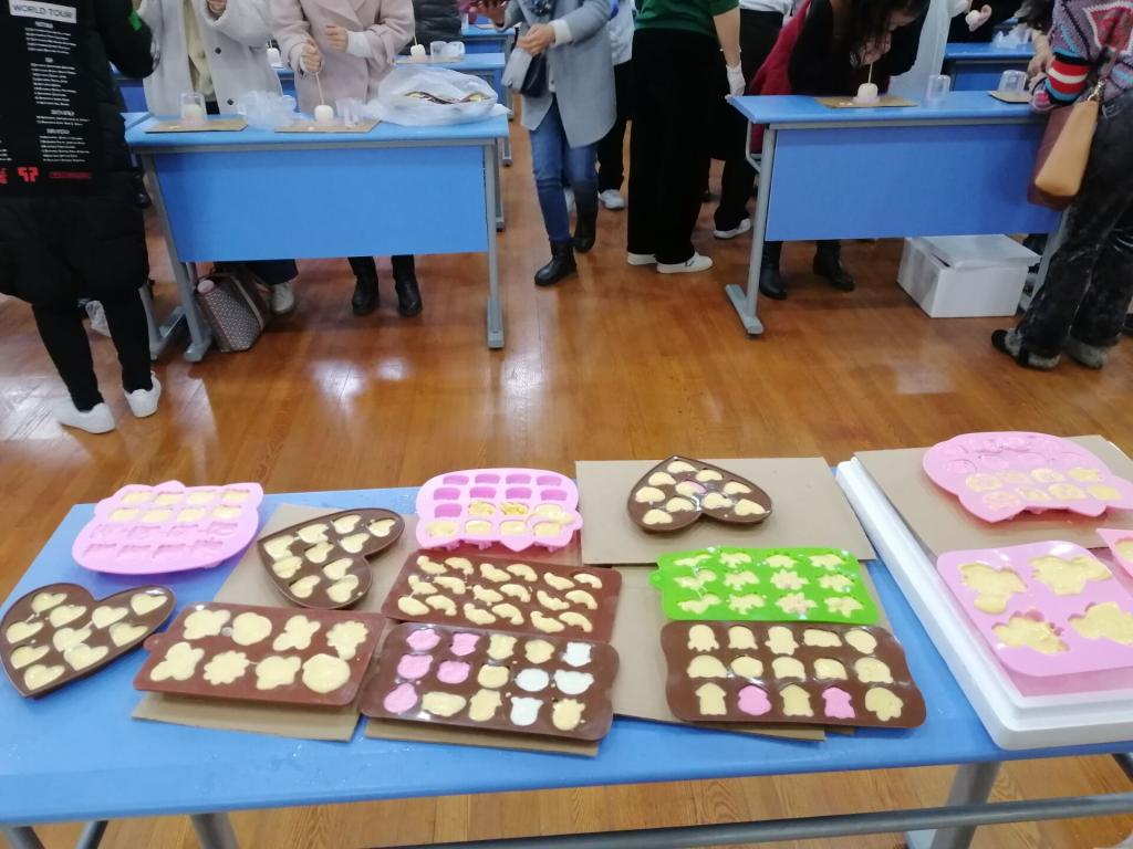 下午130,学院的女老师闻着浓浓巧克力的甜甜香味,陆续走进活动场所。蛋糕店的师傅已经准备好DIY材料——融化好的巧克力,每位老师都积极地选好巧克力制作模具,按照专业师傅的指导方法,细心地慢慢地把巧克力加入到模具中,冷冻凝固。在等待定型的过程中,大家又跟着师傅制作了女神果——慕斯蛋糕。最后每位老师收获了自己制作的诱人巧克力和一枚慕斯蛋糕。