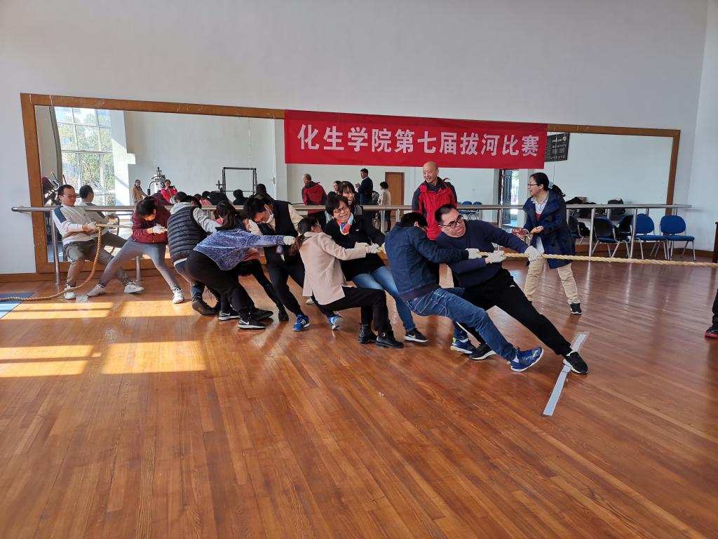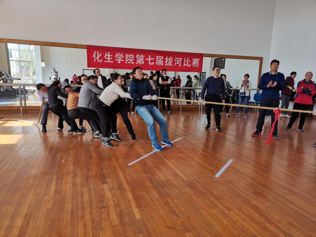 参赛队分为五支,分别是行政学工、实验中心、化学化工系、材料化学系、生物系,每支队伍参赛人员不超过12人。赛场上参赛队做着精心排兵布阵,运用各种技巧,比如老师间顶着脚、身体下蹲、拉直绳子等,场上多次出现势均力敌的情况。加油声也此起彼伏地回荡在赛场上,每一场比赛都吸引着大家的注意,期待着结果。每年比赛的冠军都出人意料,又实至名归,这次比赛的冠军队是化学化工系。