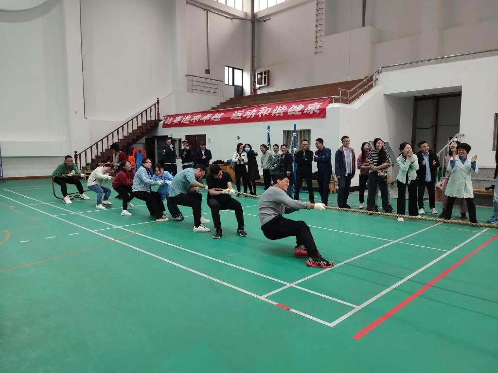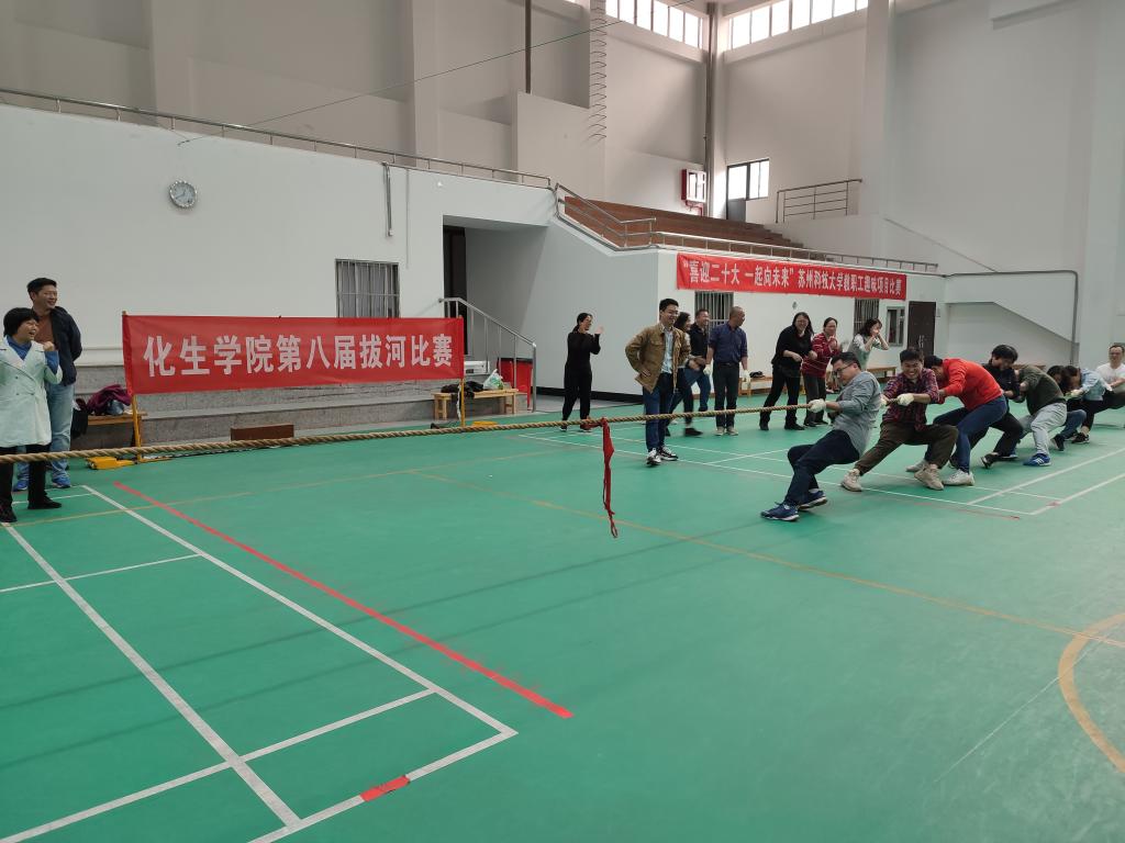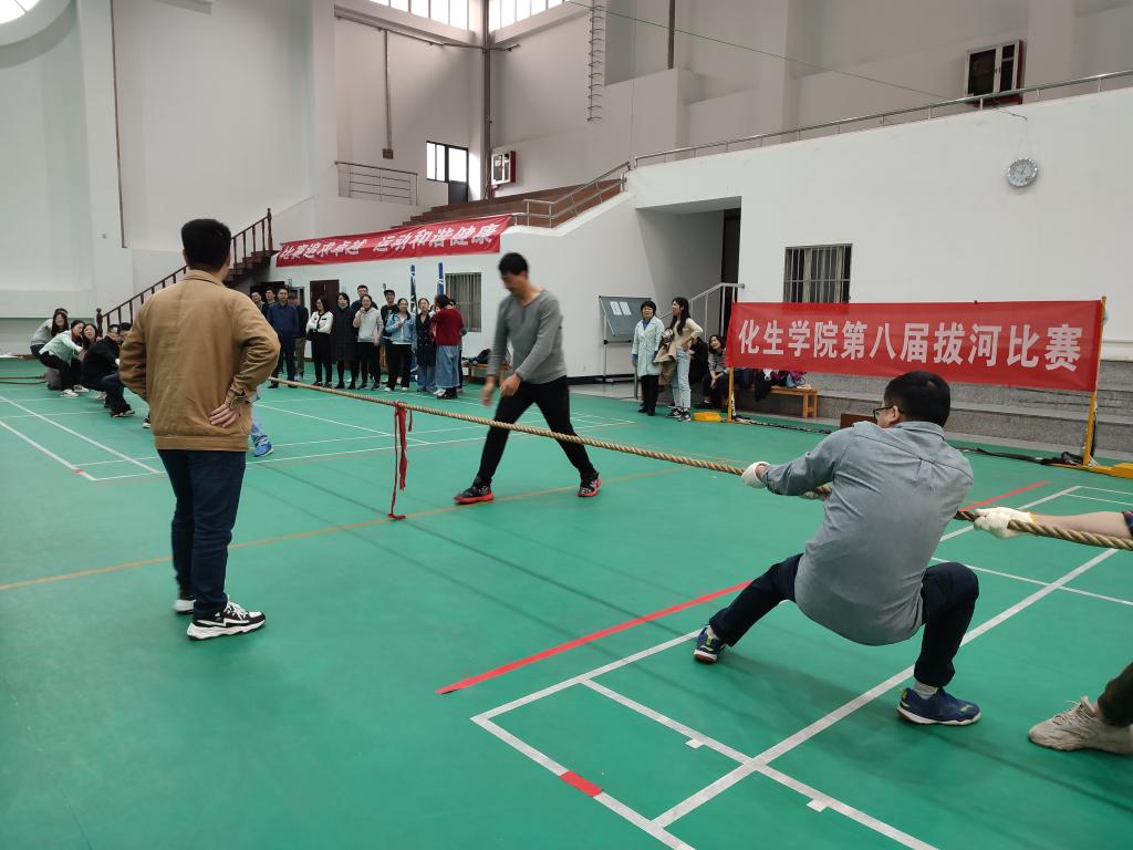 2022年11月3日,恰逢学校运动会,化生学院拔河比赛在“教工之家”秩序井然的进行。参赛队伍包括行政学工、实验中心、化学化工系、材料化学系、生物系,每支队伍参赛人员不超过10人。赛场上参赛队做着精心排兵布阵,执行各种技巧,比如老师间顶着脚、身体下蹲、拉直绳子等,场上多次出现势均力敌的情况。加油声也此起彼伏地回荡在赛场上,每一场比赛都揪着心,期待着结果。最终,冠军队属于化学化工系。比赛结束后,图书馆的几位老师与冠军队进行了一场友谊赛,冠军队赢得比赛。