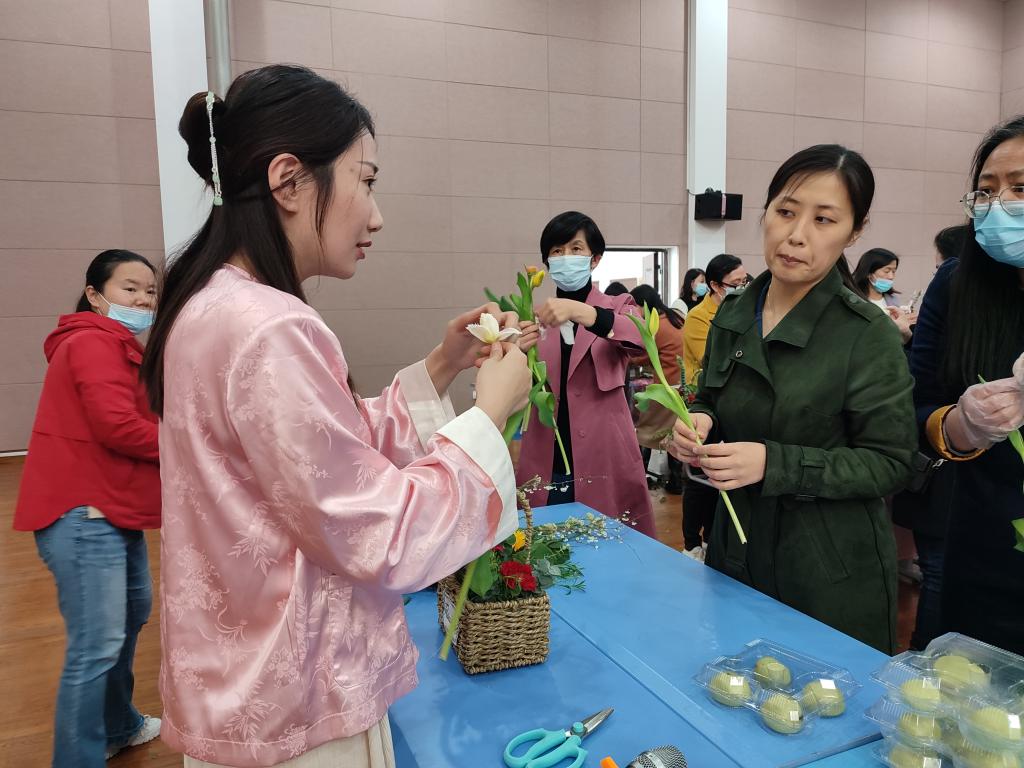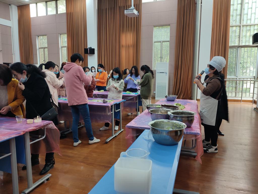 活动在悠扬的歌声中拉开帷幕,老师们迈着轻快的脚步进入活动场地。首先,在烘焙师的指导下,开始揉捏手中冒着春天气息的墨绿色面团、搓圆、压扁、包馅、封口、独特造型,最后将自己的成品放入蒸锅。接着,在青团蒸熟的过程中,在花艺老师的指导下开始插花。大家认真听老师讲插花的流程、花名、含义,在大脑中对自己的花篮形成独特构思,非常专注的开始修剪花枝、搭配色彩、花朵造型、插入花篮等,分享着创作花篮的乐趣。最后,花篮制作完成,青团子也熟了,老师们吃着青团子,相互欣赏花篮,赞美之词溢于言表,笑容也展开在每一位老师脸上,这么美的景象,也留在了照片中,形成每位老师心中美好的记忆。