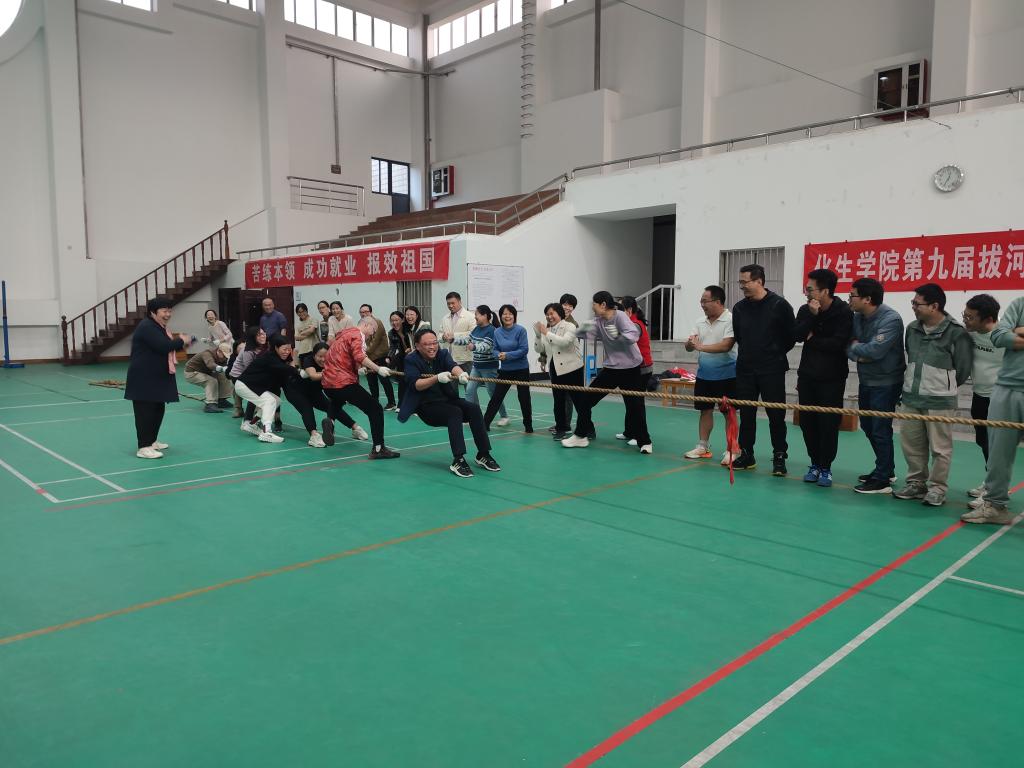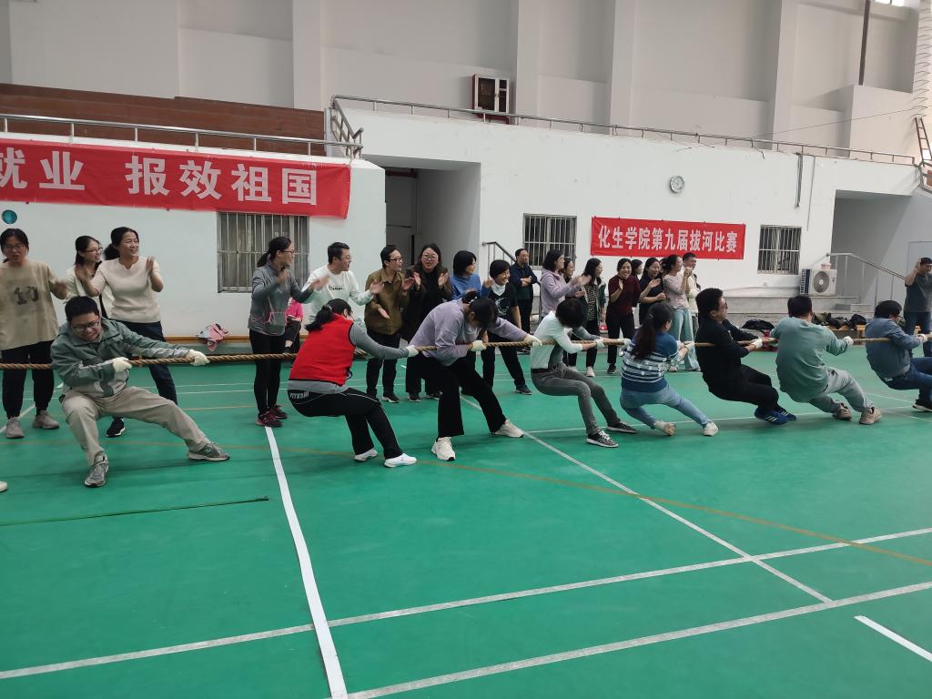 2024年10月24日,化生学院拔河比赛在“教工之家”秩序井然的进行。参赛队伍包括行政学工、实验中心、化学化工系、材料化学系、生物系,每支队伍参赛人员不超过10人。本次比赛采用小组淘汰赛的模式,其中化学化工系作为上届冠军直接进入第二轮比赛。赛场上参赛队伍做着精心排兵布阵,执行各种技巧,比如老师间顶着脚、身体下蹲、拉直绳子等,场上多次出现势均力敌的情况。加油声也此起彼伏地回荡在赛场上,每一场比赛都揪着心,期待着结果。最终,化学化工系成功卫冕。