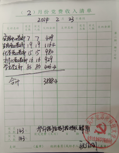 全院共收到实验中心教工党支部、化学化工系教工党支部、材料化学系教工党支部、生物系教工党支部和学生党支部143名党员交纳党费的3888.4元。