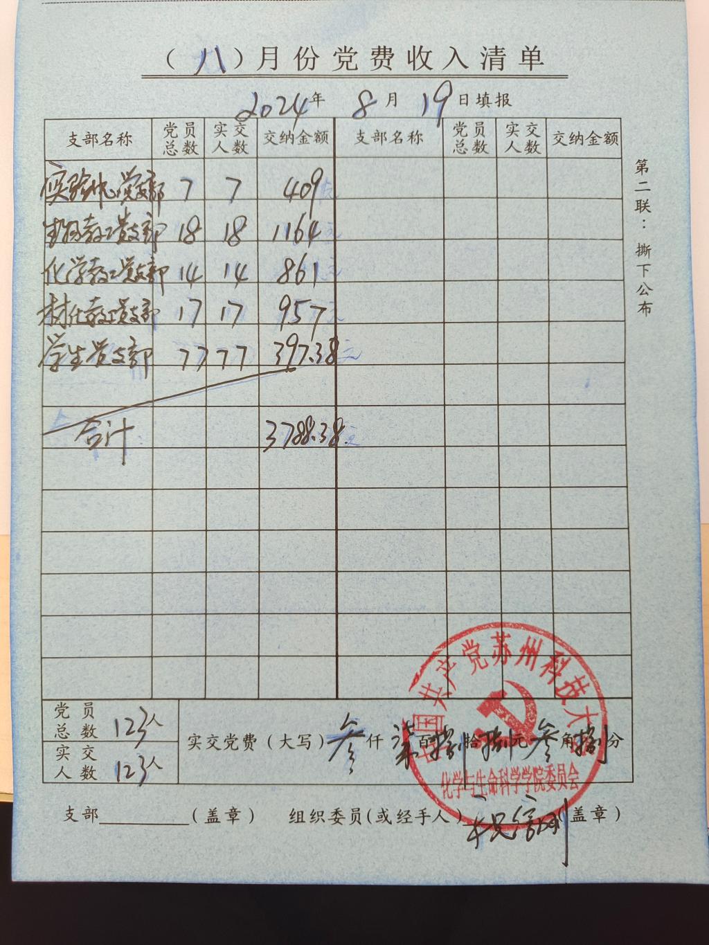 全院共收到实验中心党支部、化学化工系教工党支部、材料化学系教工党支部、生物系教工党支部和学生党支部123名党员交纳党费的3788.38元。