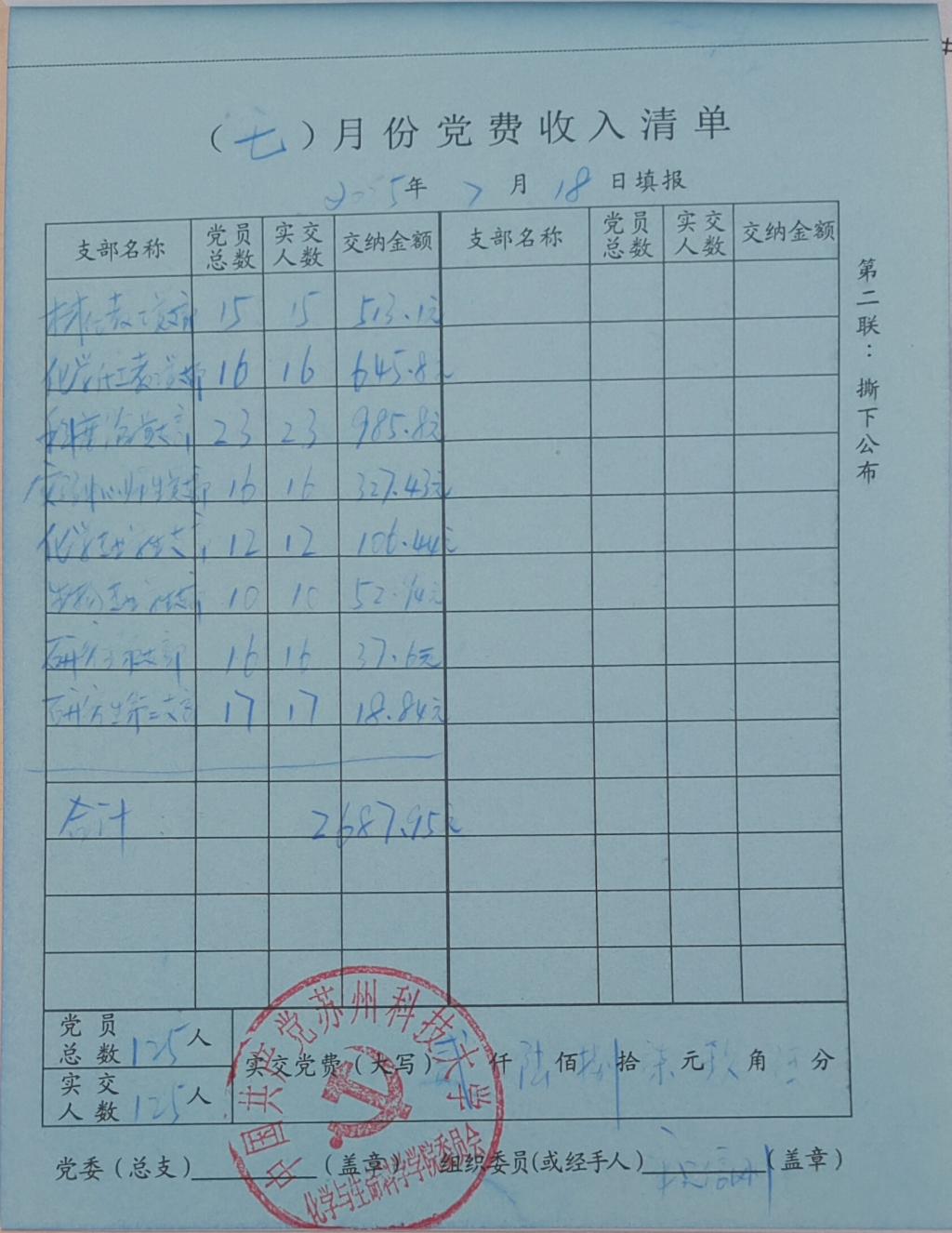 全院收到材化教工党支部、化学化工教工党支部、科普馆党支部、实验中心党支部、学生党支部125名党员交纳的7月党费共计2687.95元。