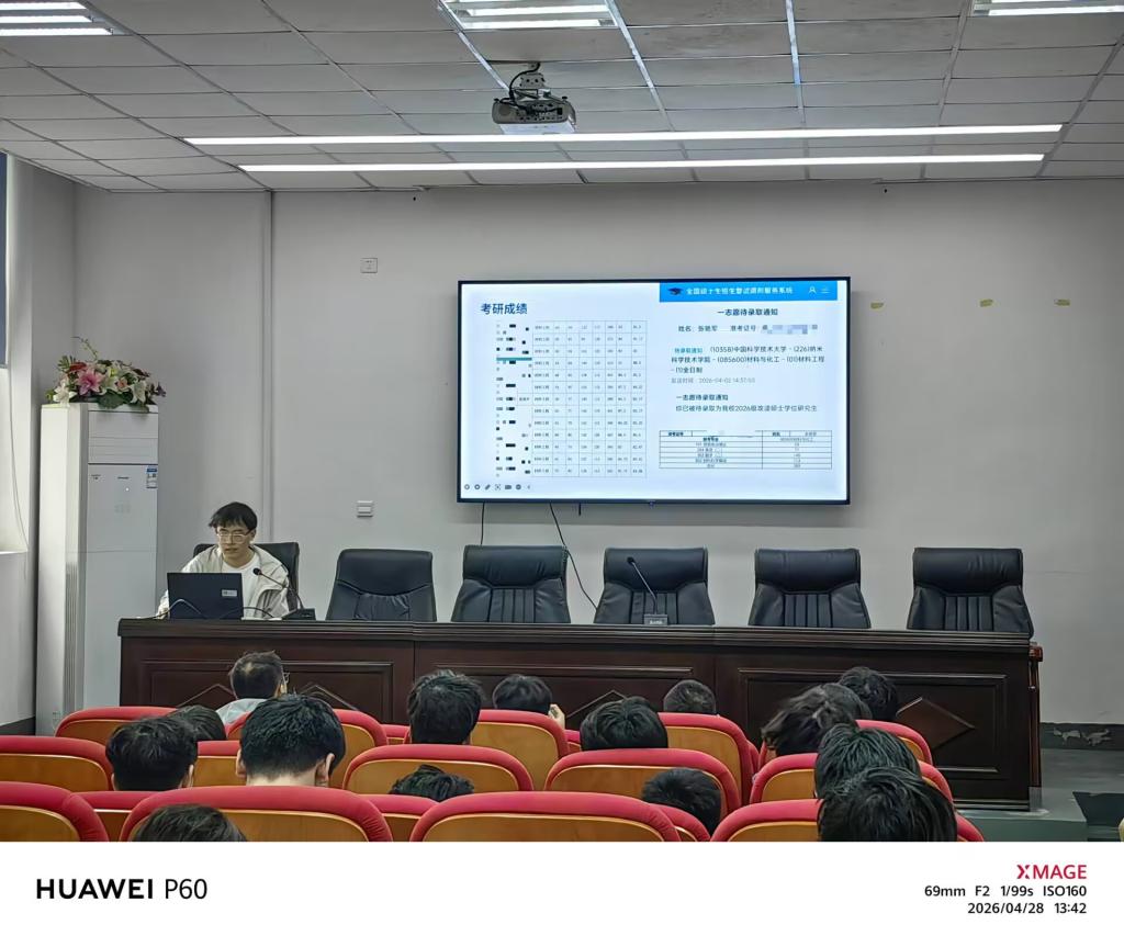 为帮助2023级材料化学专业学生明确考研方向、科学规划备考路径,4月28日,学院在教三109教室召开考研动员及经验交流会。会议邀请2022级五位成功考取知名高校的优秀学生代表分享备考心得,辅导员伊绵帅作考研动员讲话,23级材料化学专业全体学生参加。