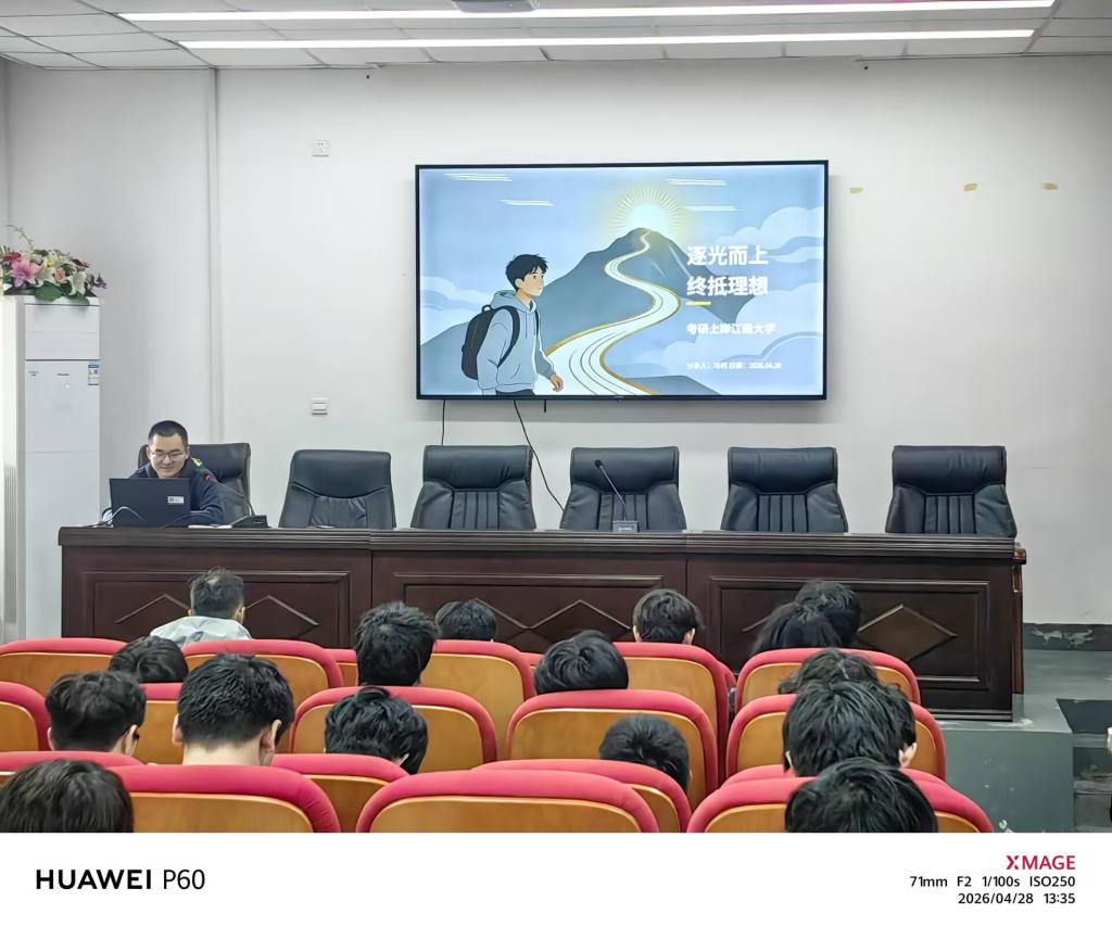 随后,辅导员伊绵帅从当前就业形势与职业发展角度出发,深入分析了考研深造对于提升专业竞争力、拓宽就业渠道的重要意义。他勉励同学们认清形势、坚定信心,将考研作为实现个人价值和职业理想的重要阶梯,脚踏实地,积极行动。